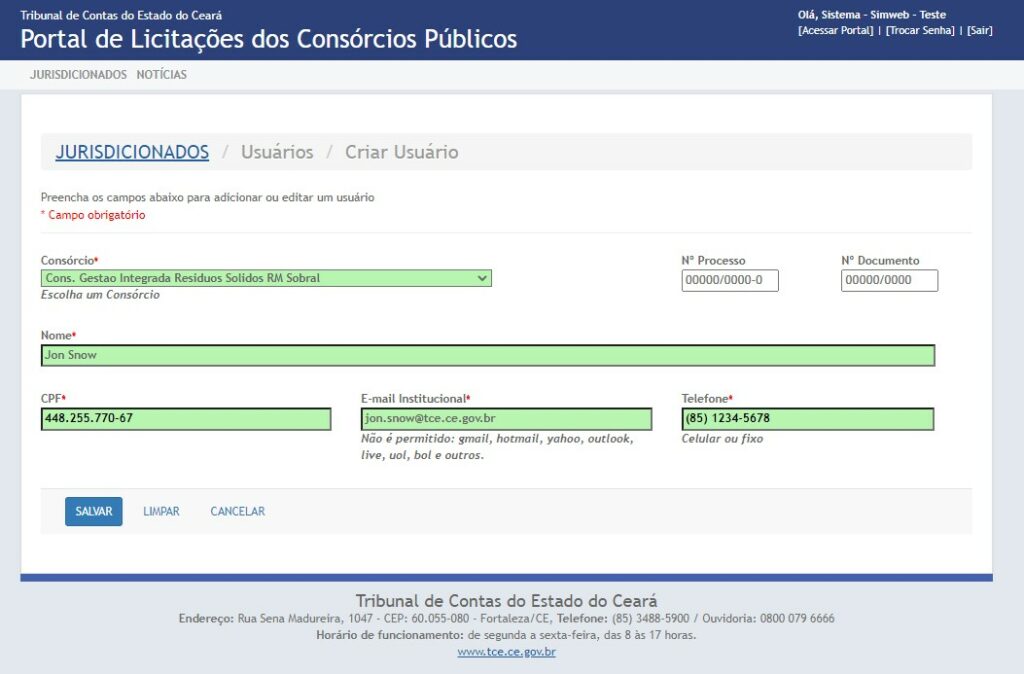 OBS: O campo CPF so pode ser preenchido com um valor válido, não sendo possível utilizar um valor fictício. O campo E-mail Institucional só pode ser preenchido com e-mail, sendo assim não irá permitir e-mails do tipo: @gmail, @hotmail, @yahoo, @outlook, @live, @uol, @bol