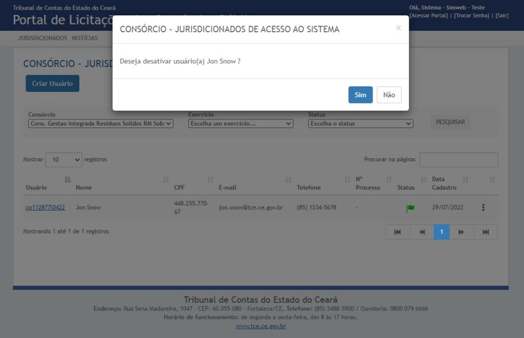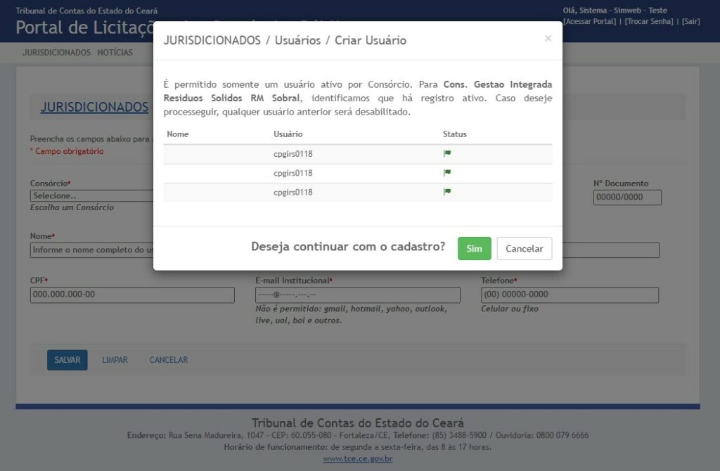 2.2) Pode ocorrer nesse momento um aviso importante do sistema onde o mesmo irá informa que já há usuário cadastrado no Consórcio informado durante o cadastro. Isso acontece pois é permitido apenas um usuário Ativo e caso deseje prosseguir com o cadastro, o sistema irá desativar os demais deixando apenas o usuário que está sendo cadastrado no momento.