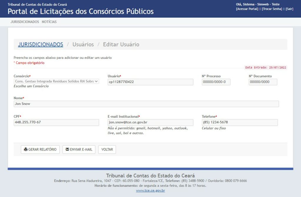 4) Logo após o aviso de confirmação de alteração, ficarão disponíveis as opções de GERAR RELATÓRIO e ENVIAR E-MAIL com os dados atualizados do usuário.