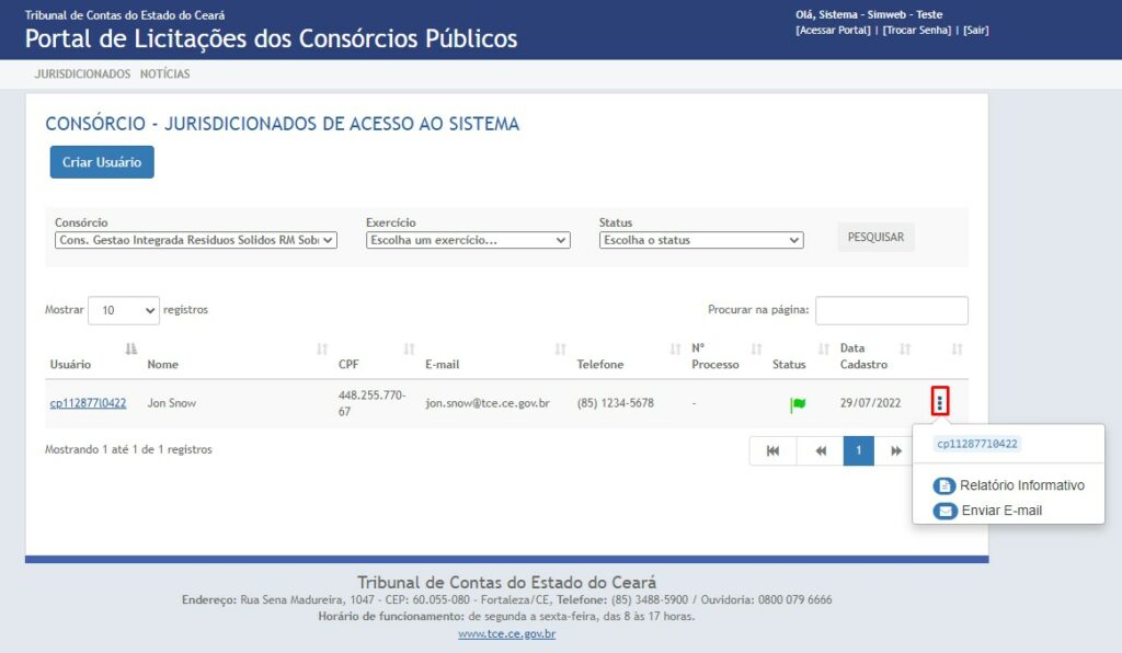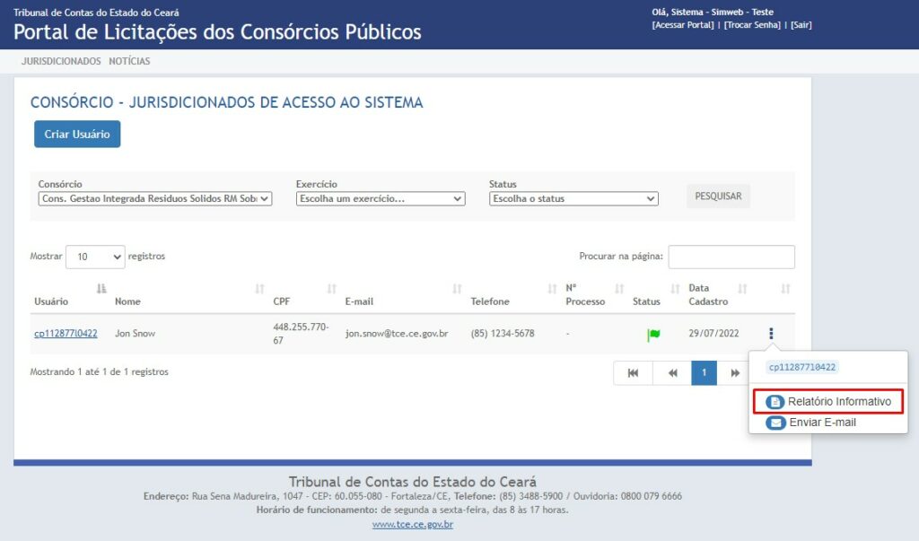 1) Para cada usuário da lista é possível gerar o Relatório Informativo através da opção destacada conforme ilustrado abaixo.