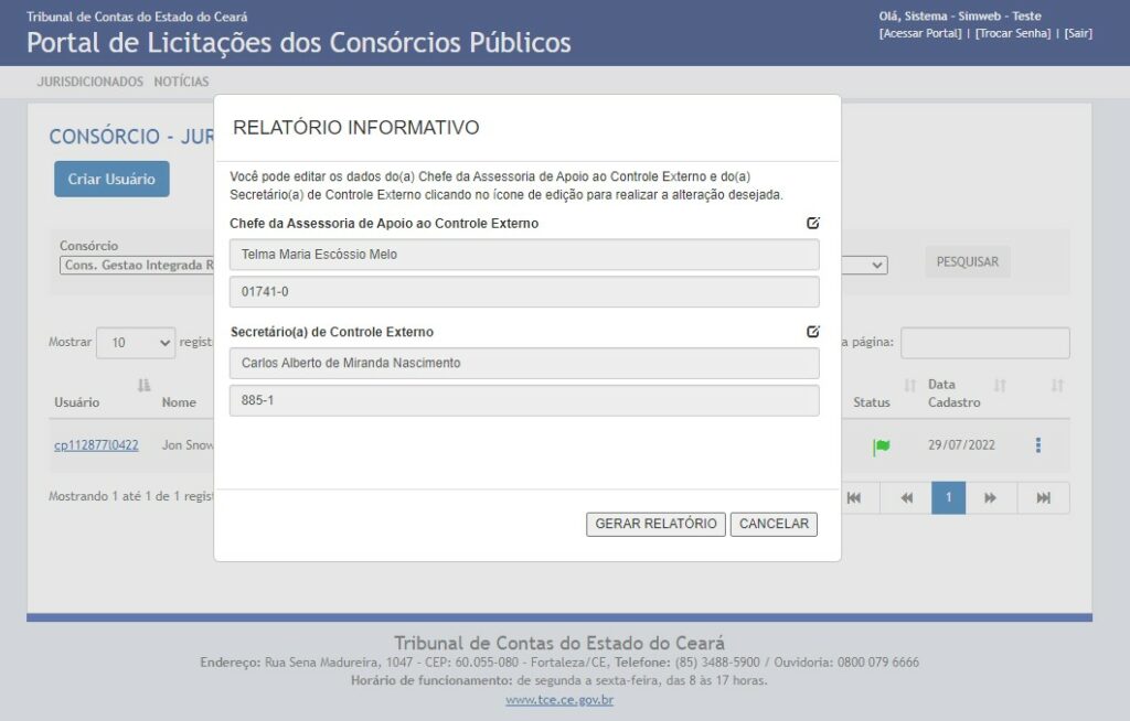 2) Em seguida uma janela será exibida com as opções para editar caso seja necessário, o nome e a matrícula do Chefe da Assessoria de Apoio ao Controle Externo e também Secretário(a) de Controle Externo.