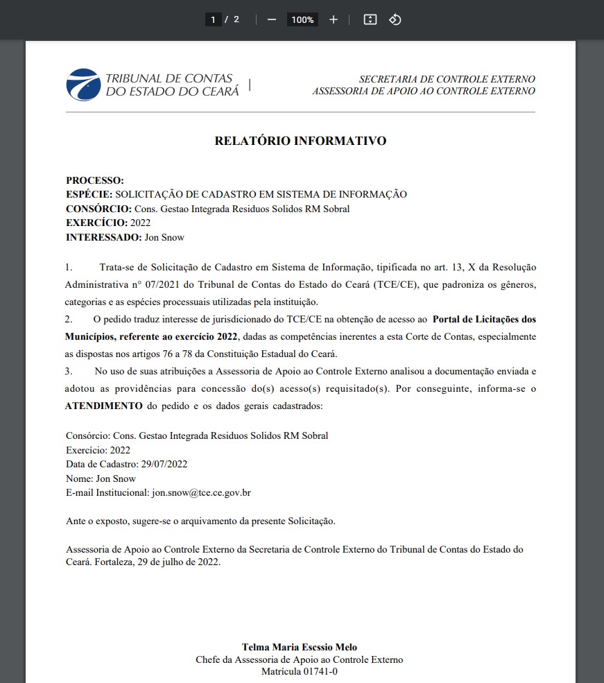 3) Após gerar o RELATÓRIO INFORMATIVO uma nova janela será aberta com o relatório preenchido dinamicamente conforme os dados cadastrados do usuário.