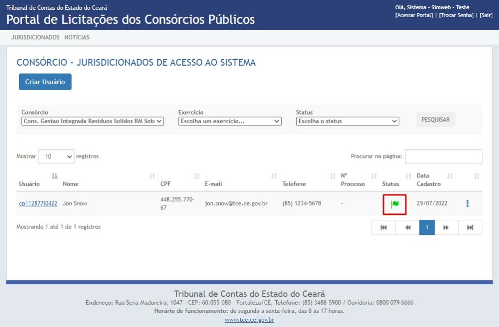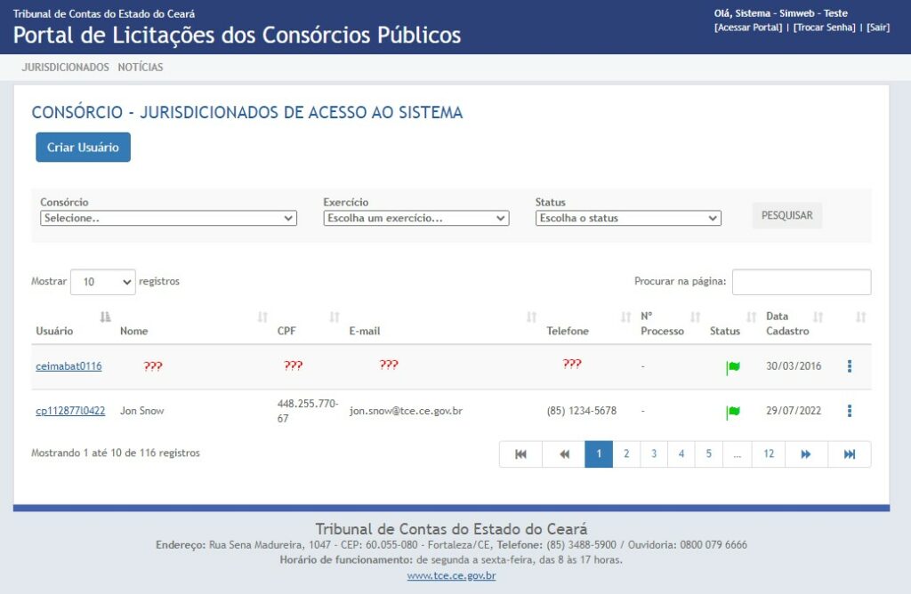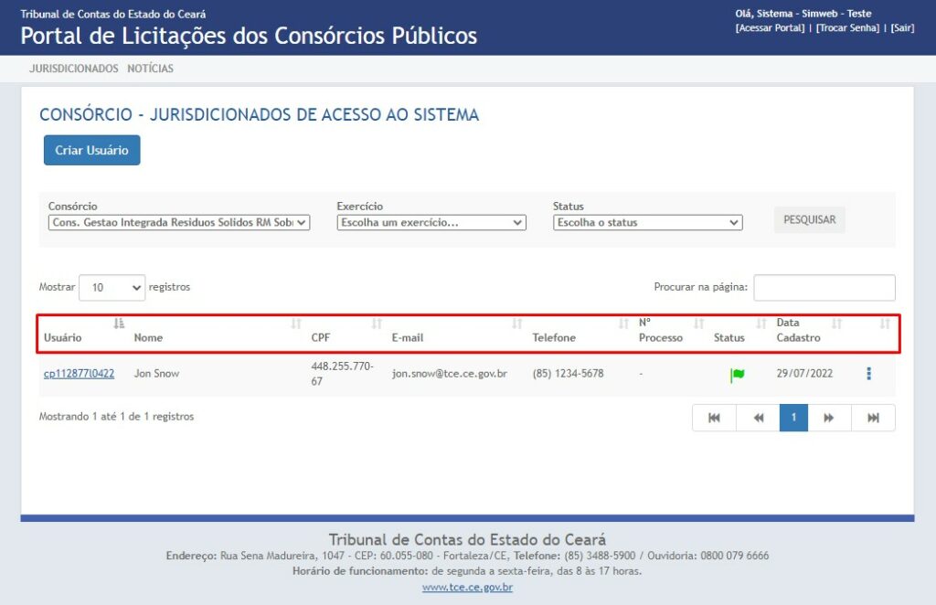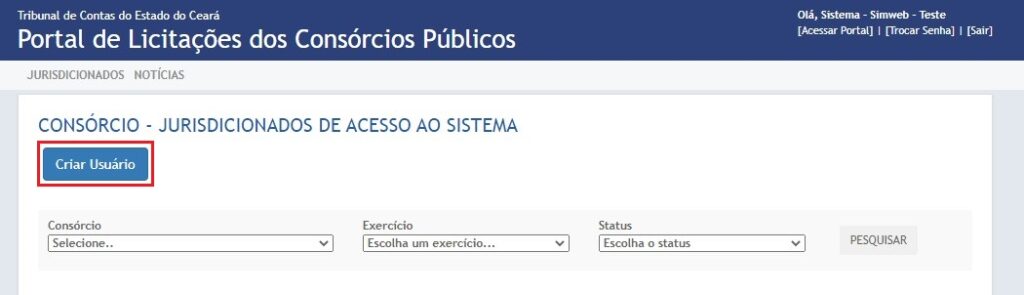 1) Ao clicar no menu JURISDICIONADOS > Usuários, o sistema irá exibir a tela com a lista dos Jurisdicionados cadastrados contendo o botão CRIAR USUÁRIO.