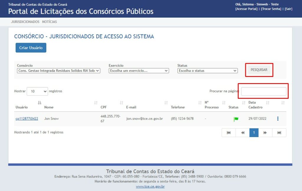 2) Na tela de listagem de usuários é possível realizar uma pesquisa através dos filtros Municípios, Exercício, Unidade e Status e ao clicar em PESQUISAR novos dados serão exibidos na lista.