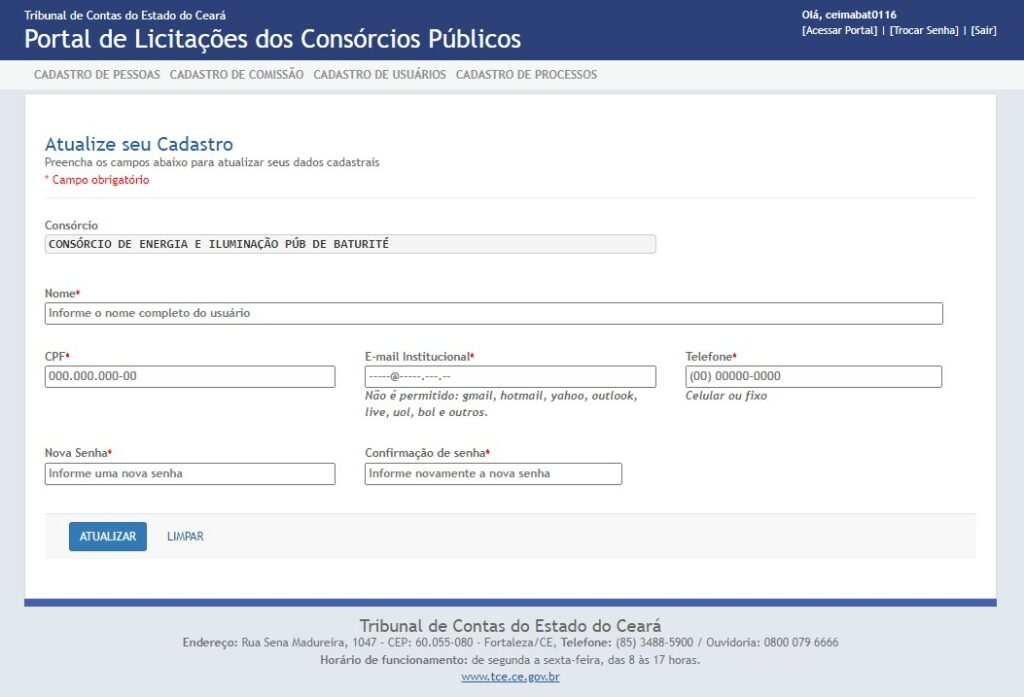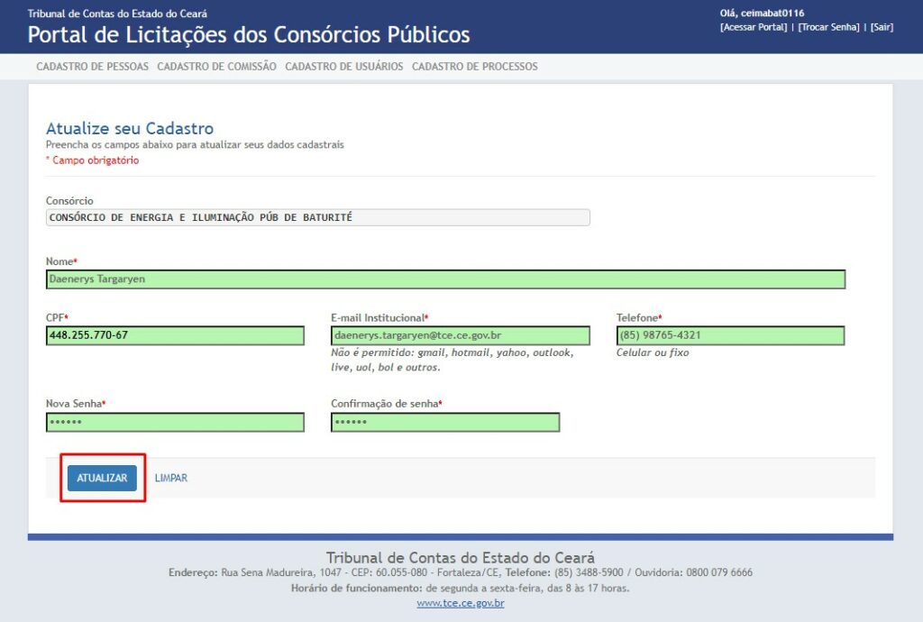 3) Após preencher os dados obrigatórios basta clicar em ATUALIZAR que em seguida o sistema irá enviar um e-mail com os dados atualizados conforme preenchido nos campos do formulário.