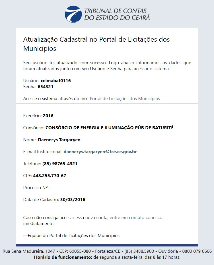 4) Exemplo de e-mail de Atualização Cadastral contendo as informações atualizadas do usuário para o devido acesso ao sistema