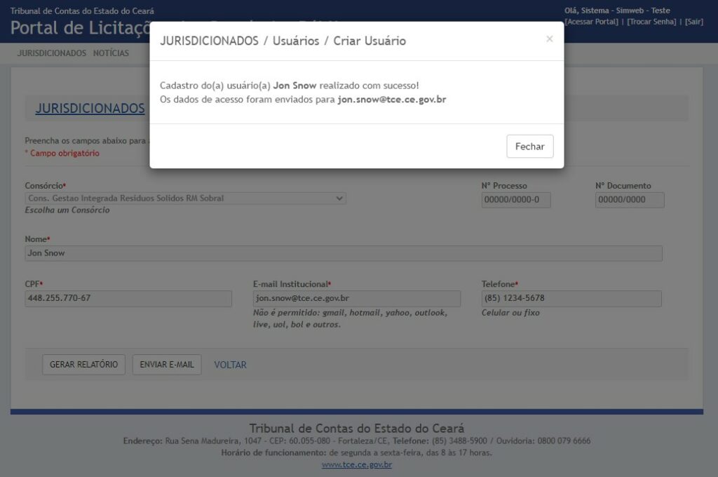 3) O sistema irá exibir a confirmação de usuário cadastrado com sucesso e enviará um e-mail com os do dados cadastrados.