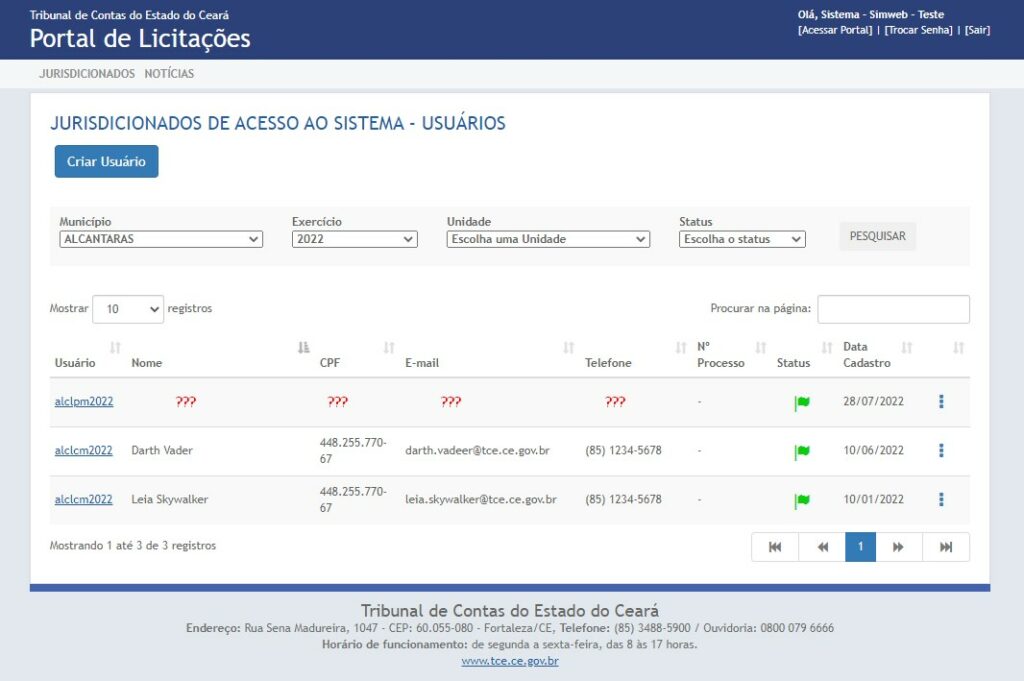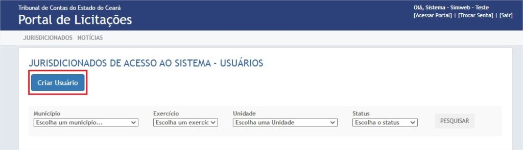 1) Ao clicar no menu JURISDICIONADOS > Usuários, o sistema irá exibir a tela com a lista dos Jurisdicionados cadastrados contendo o botão CRIAR USUÁRIO.