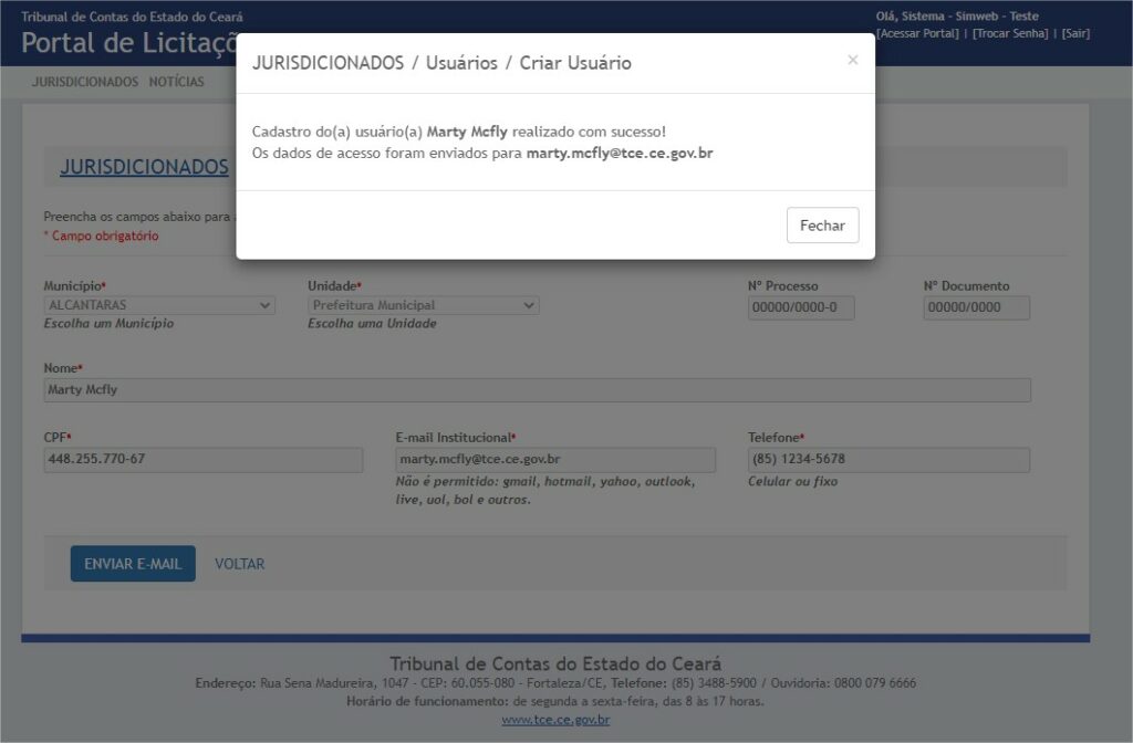 3) O sistema irá exibir a confirmação de usuário cadastrado com sucesso e enviará um e-mail com os do dados cadastrados.