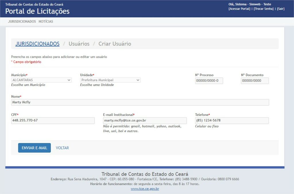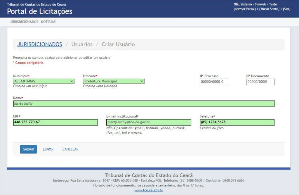 OBS: O campo CPF so pode ser preenchido com um valor válido, não sendo possível utilizar um valor fictício. O campo E-mail Institucional só pode ser preenchido com e-mail, sendo assim não irá permitir e-mails do tipo: @gmail, @hotmail, @yahoo, @outlook, @live, @uol, @bol