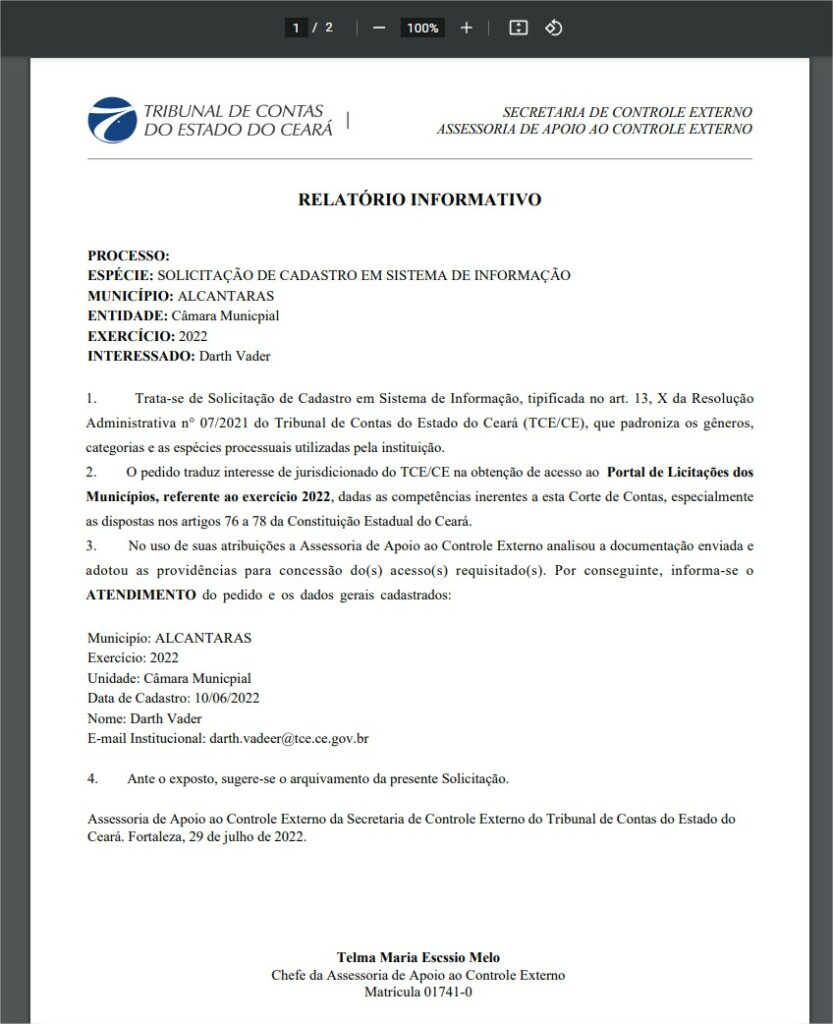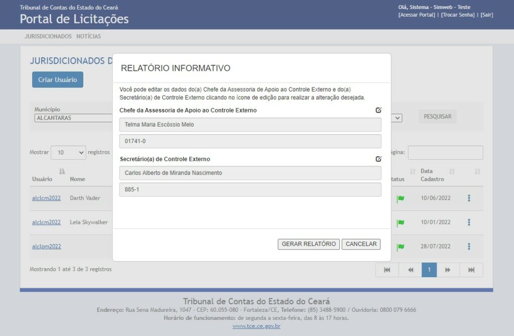 2) Em seguida uma janela será exibida com as opções para editar caso seja necessário, o nome e a matrícula do Chefe da Assessoria de Apoio ao Controle Externo e também Secretário(a) de Controle Externo.