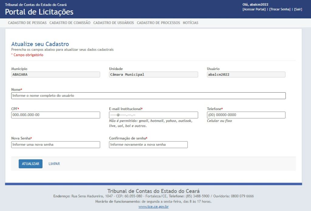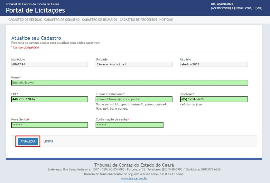 3) Após preencher os dados obrigatórios basta clicar em ATUALIZAR que em seguida o sistema irá enviar um e-mail com os dados atualizados conforme preenchido nos campos do formulário.