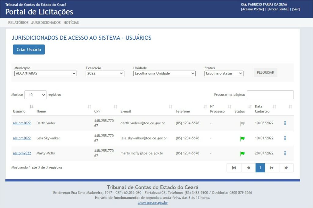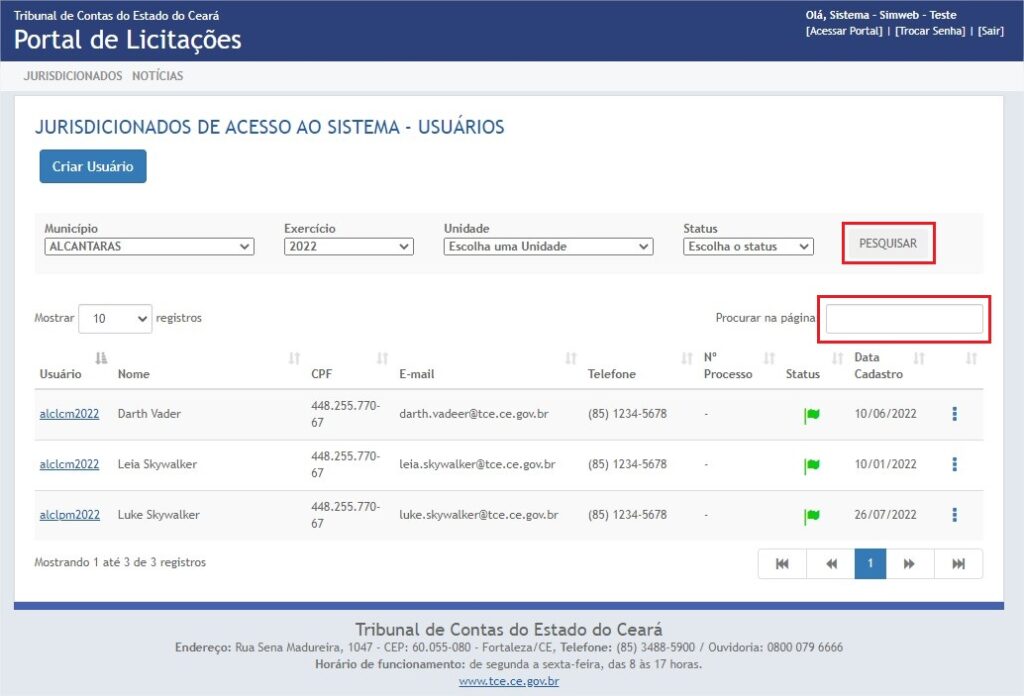 2) Na tela de listagem de usuários é possível realizar uma pesquisa através dos filtros Municípios, Exercício, Unidade e Status e ao clicar em PESQUISAR novos dados serão exibidos na lista.