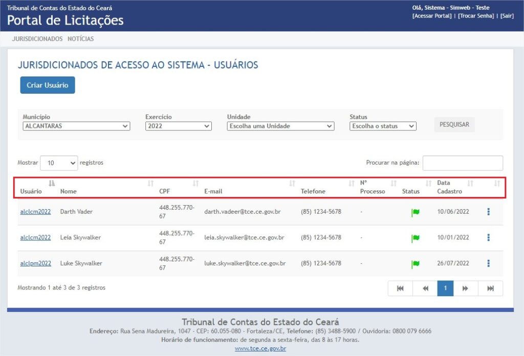 1) A lista de Usuários é organizada e ordenada pelos campos: Usuário, Nome, CPF, E-mail, Telefone, Processo, Status e Data de Cadastro. Ao clicar nesses títulos a coluna será ordenada de forma Ascendente ou Descendente conforme os dados listados.