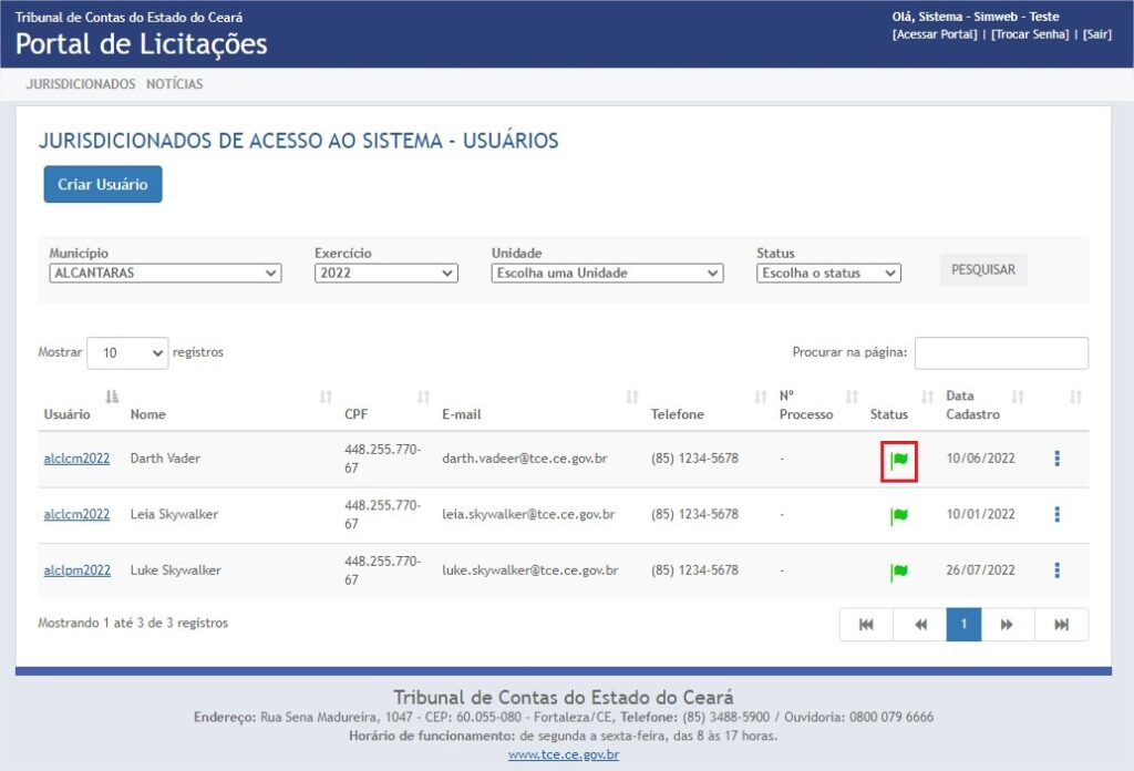 Usuário ativos são representados pelo ícone flag em verde conforme representado abaixo e os desativados o ícone flag estará cinza.
