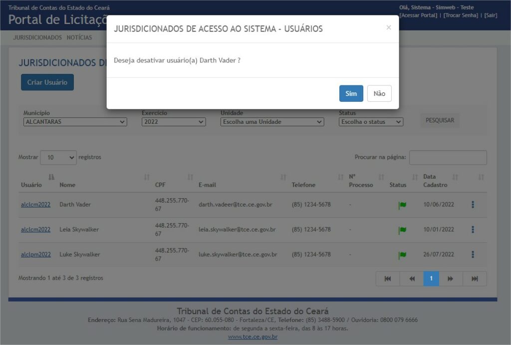 2) Ao clicar no ícone flag o sistema ira exibir um confirmação para a ação desejada. Caso o status do usuário seja ativo o sistema irá desativa-lo e assim vice-versa, ativando se o status do usuário for desativado.