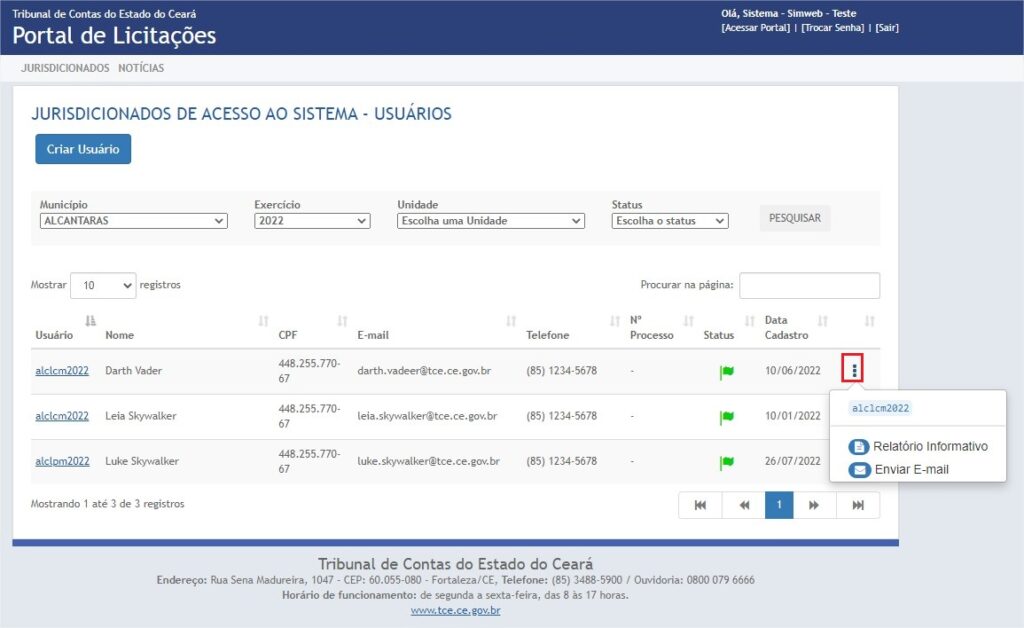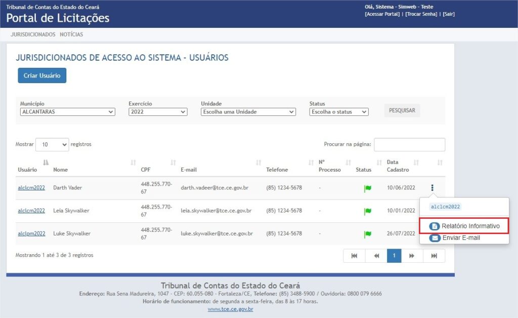 1) Para cada usuário da lista é possível gerar o Relatório Informativo através da opção destacada conforme ilustrado abaixo.