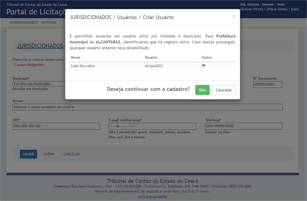 2.2) Pode ocorrer nesse momento um aviso importante do sistema onde o mesmo irá informa que já há usuário cadastrado na Unidade e Município informado durante o cadastro. Isso acontece pois é permitido apenas um usuário Ativo e caso deseje prosseguir com o cadastro, o sistema irá desativar os demais deixando apenas o usuário que está sendo cadastrado no momento.